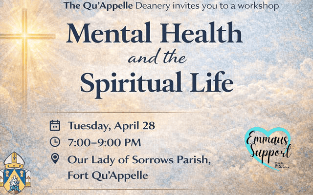 Mental Health and the Spiritual Life - An Introduction to Mental Health Ministry Our Lady of Sorrows Church, Fort Qu'Appelle Tuesday, April 28 | 7:00pm - 9:00pm All are welcome