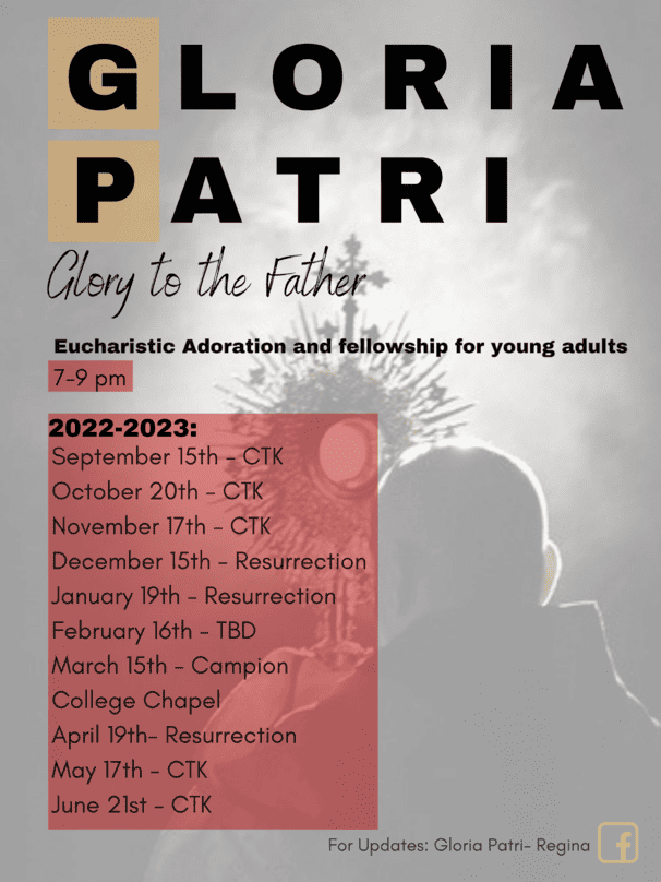 Gloria Patri is an evening of Eucharistic Adoration, Reconciliation (Confession) and Community. Gloria Patri happens once a month at various parishes around Regina. Check out their Facebook page for the most up-to-date information.