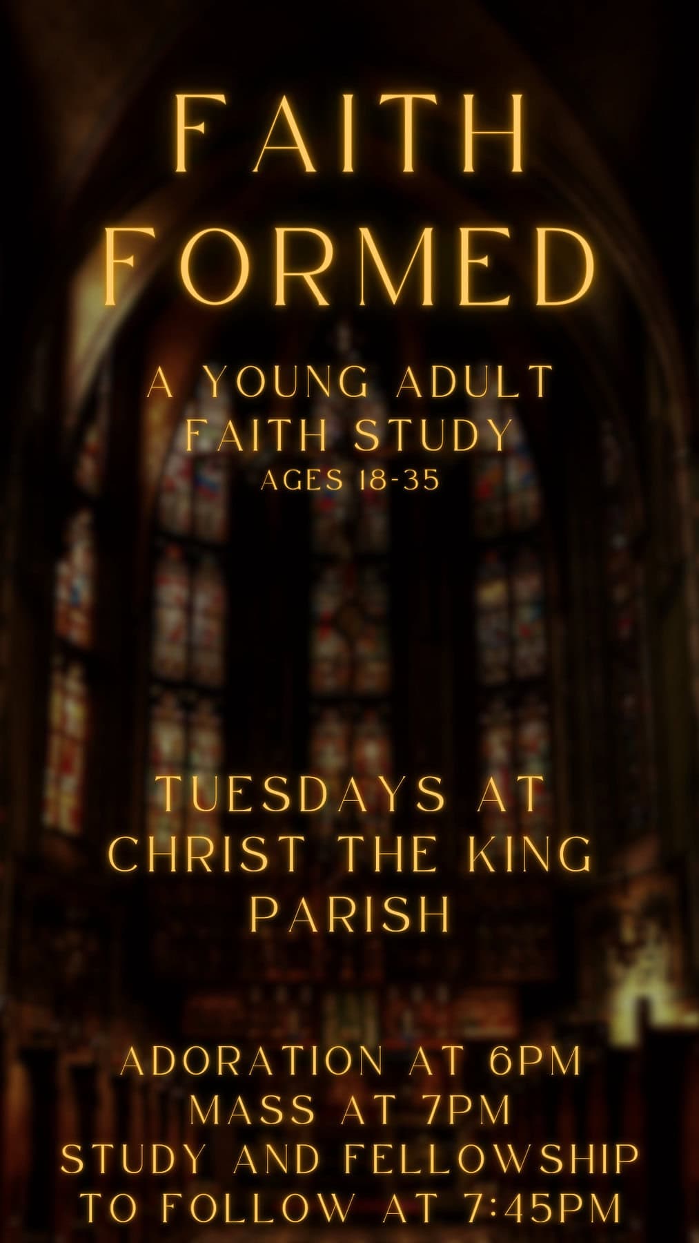 Join us Tuesdays at Christ the King Parish for Faith Formed, an evening of community, faith formation, and prayer.