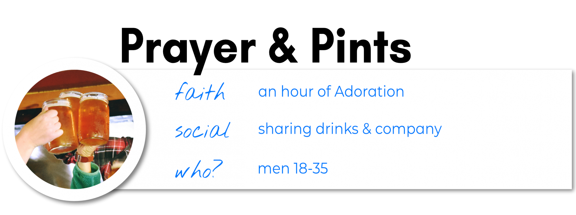 This small group is a mens group that meets for an hour of Adoration, followed by food and drinks at a local pub. Discussion could range from how God has been moving in their lives, discerning a vocation, or how the Riders are doing.