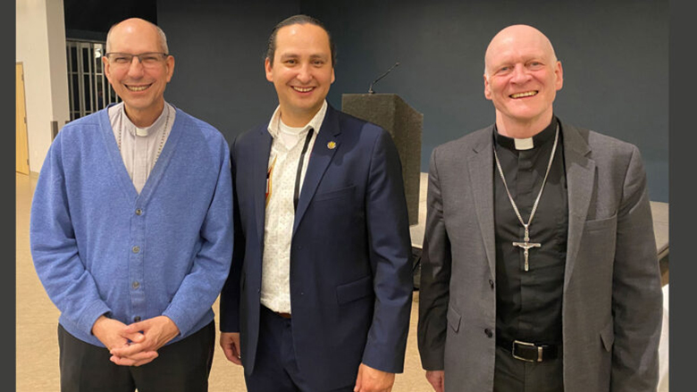 Walking With Your Neighbour: connection, friendship and reconciliation were the themes of an adult faith formation event April 28 in Saskatoon, featuring (l-r) guest speakers Archbishop Donald Bolen of Regina and Chief Cadmus Delorme of Cowessess First Nation, welcomed by Bishop Mark Hagemoen of the Roman Catholic Diocese of Saskatoon. About 250 attended the Dessert Night, held at the Cathedral of the Holy Family. (Photo – Catholic Saskatoon News)