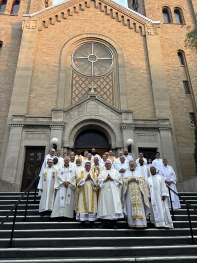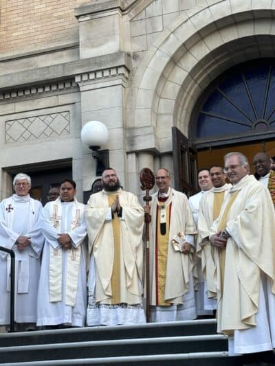Deacons Ken Fahlman and Martin Kondzielewski on the steps of Holy Rosary Cathedral following their ordination to the diaconate on June 14, 2024