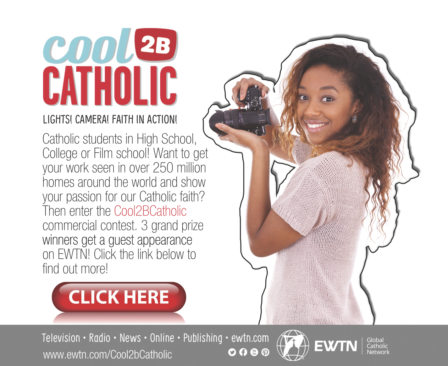 Attention Catholic high school, college or film school students!! Enter your commercial in EWTN’s Cool 2B Catholic Contest – See attached poster to get details about entering EWTN’s Cool 2B Catholic contest or go to https://c2bc.ewtn.com for details. To download poster click here